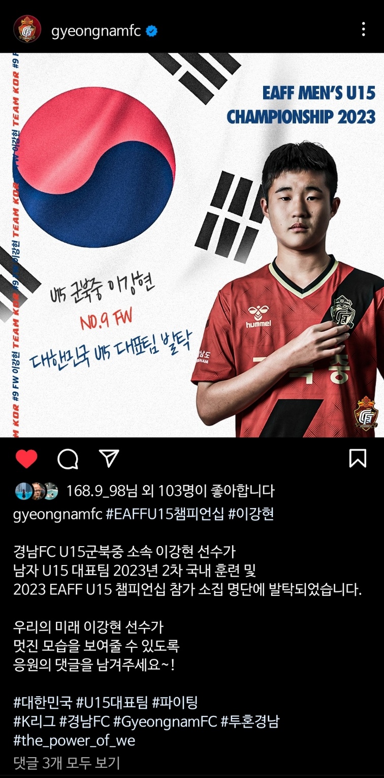 후원 장학생 경남FC U15 군북중 소속 이강현 선수 대한민국 대표님 발탁